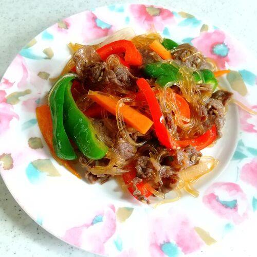 料理あるある 前回、豚肉と春雨でチャプチェを作った ら美味しかったので、 今回は、豚肉を牛肉に変えて作ってみま した。 牛肉を入れる方が断然美味しいですね。 赤いパプリカを入れると彩りがキレイで す。 自分で作った料理の中で最近気に入って いるのが…