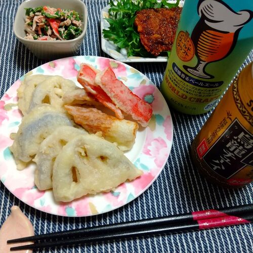 休日の家飲み🏠️🍺 私は、アテが無いと飲めない人です。 しかし、アテは何でもいいというタイ プ。 今回は天ぷらをお供に。 冷蔵庫の中にある物で、天ぷらを揚げま した。 天ぷらの中で、特に好きなのが、れんこ んと春菊です。 味覚がシブいんです^^