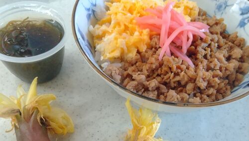 続・ミョウガ 夫が庭から採ってきました。 (⊙⊙)!! 先日、私、全部引っこ抜いたのに、 これを見落としていたということか、、 私の目は節穴。笑 花が咲いちゃってるし、巨大化してる。 これは、食べれるのか!? おうちごはん 2色丼を作りました。そぼろは、…
