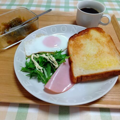 ある日の朝食 我が家は、外でモーニングというのは、 年に1回あるかないか。 とにかく、自炊派。 そんな私が、例えば、こんな朝食を作っ た時に思うこと、 それは、ファミレスのモーニングって、 1番安いものだとこんな感じだと思いま すが、500円かかります…