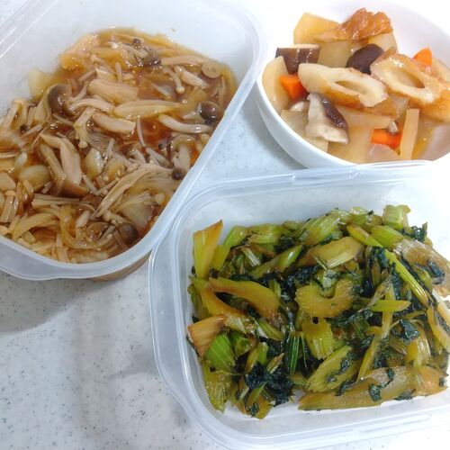 休日も休んではいられません。 𝕃𝕖𝕥'𝕤!Cooking~ 3品作りました。 ・セロリのきんぴら ・しめじとえのきと玉ねぎのマリネ ・煮物(大根・ちくわ・しいたけ・にん じん) セロリって苦手な人が多いためか? 見切り品コーナーに常にいらっしゃいま す。 その半額…